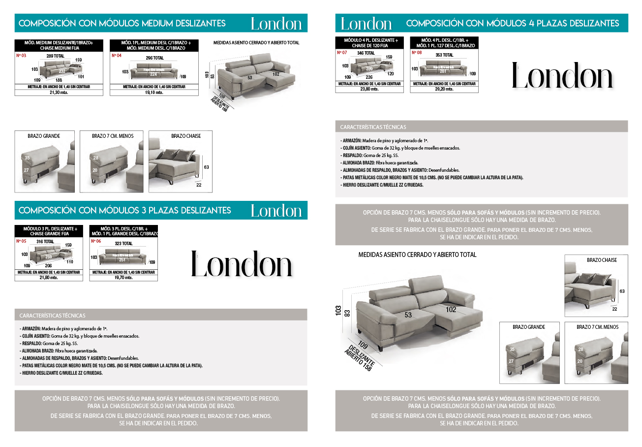 Fabricado con armazón de madera de pino y aglomerado de primera calidad, el modelo London ofrece una estructura sólida y estable, preparada para responder con firmeza en el uso continuado.