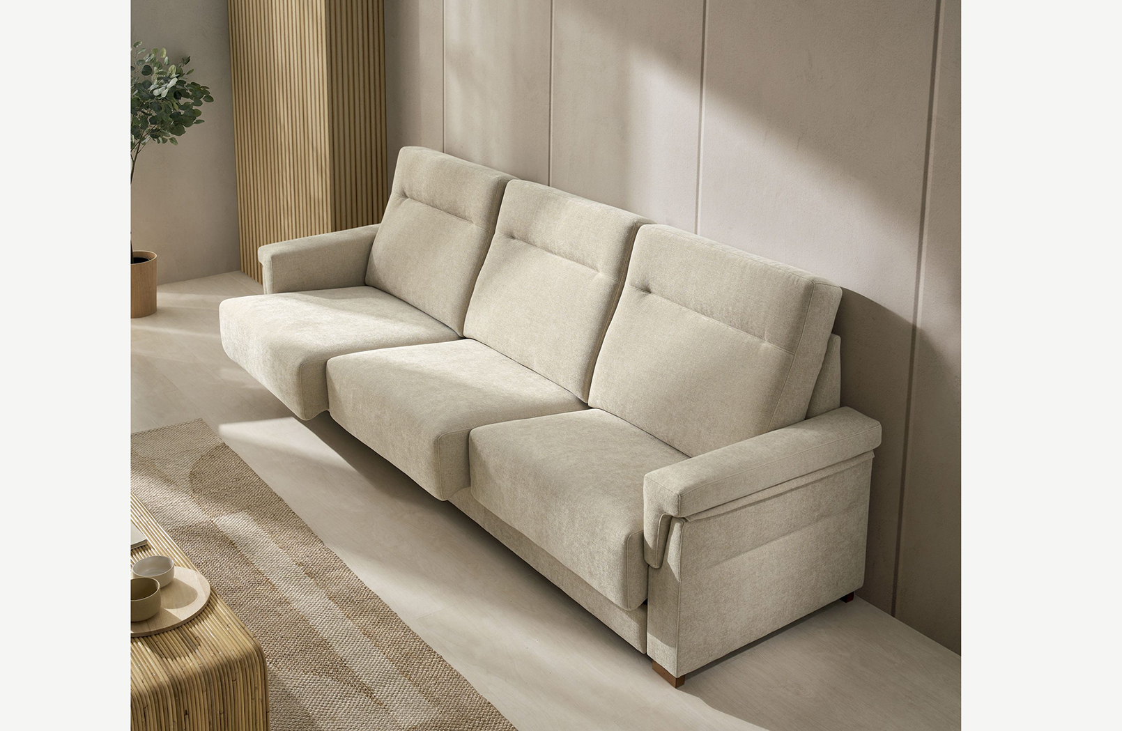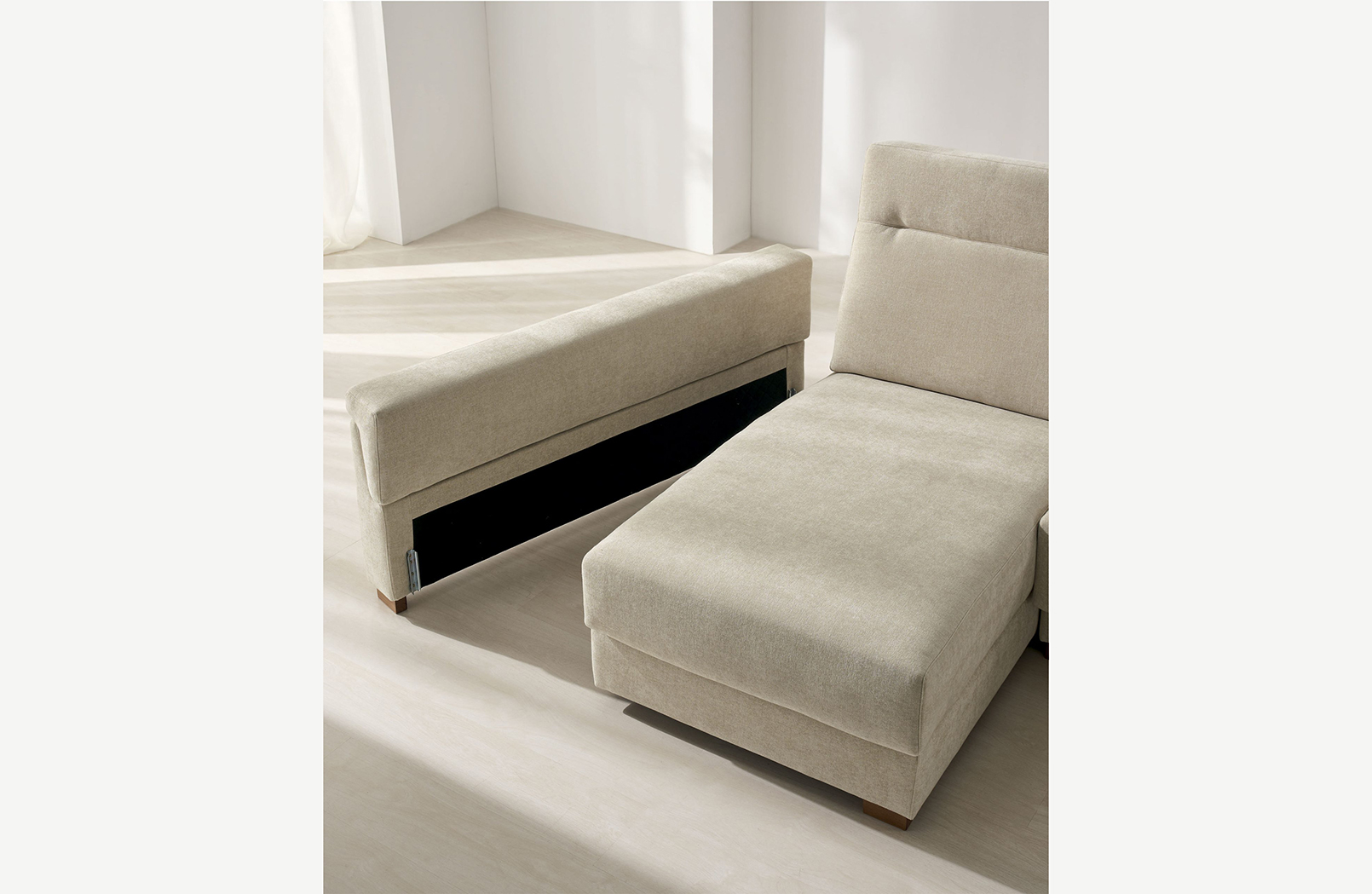 Todas las almohadas son desenfundables para facilitar su mantenimiento diario. Incorpora patas de madera de 5 cm de altura, incluidas de serie en este modelo.