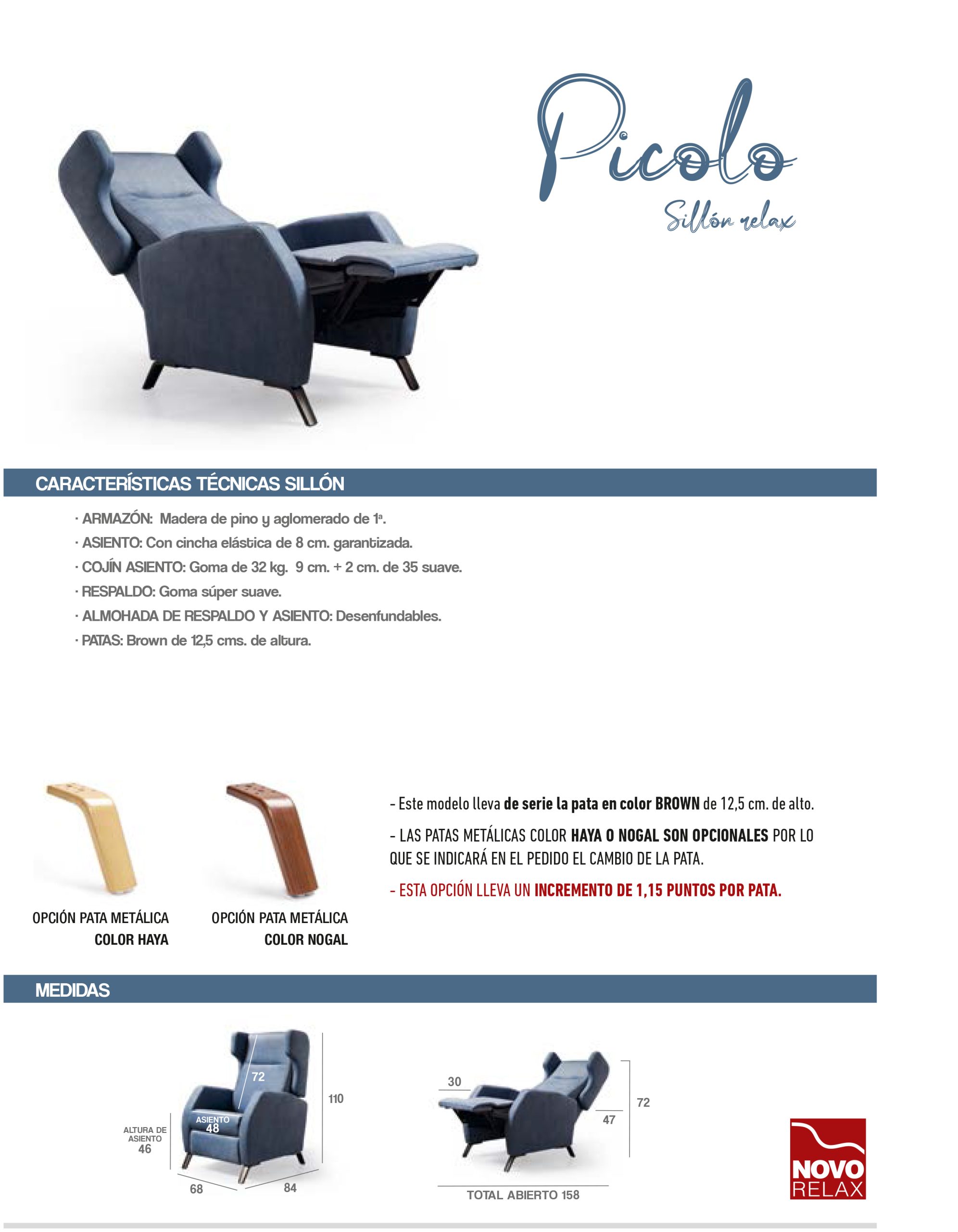 El sillón Picolo está fabricado con una estructura resistente en madera de pino y aglomerado de primera calidad, proporcionando robustez, estabilidad y confianza en cada uso.