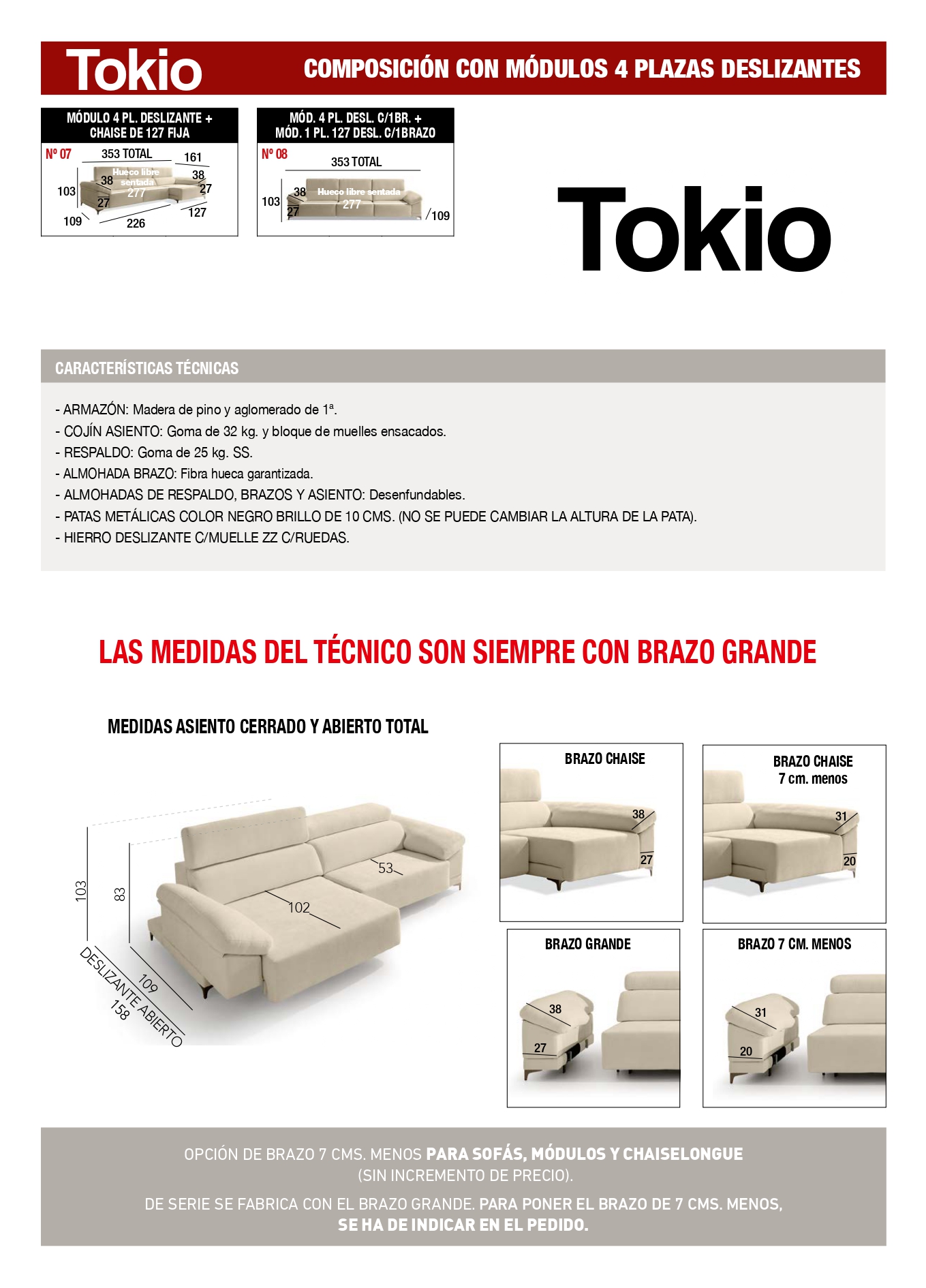 Fabricado con armazón de madera de pino y aglomerado de primera calidad, el modelo Tokio ofrece una base sólida que transmite seguridad y estabilidad en cada uso.